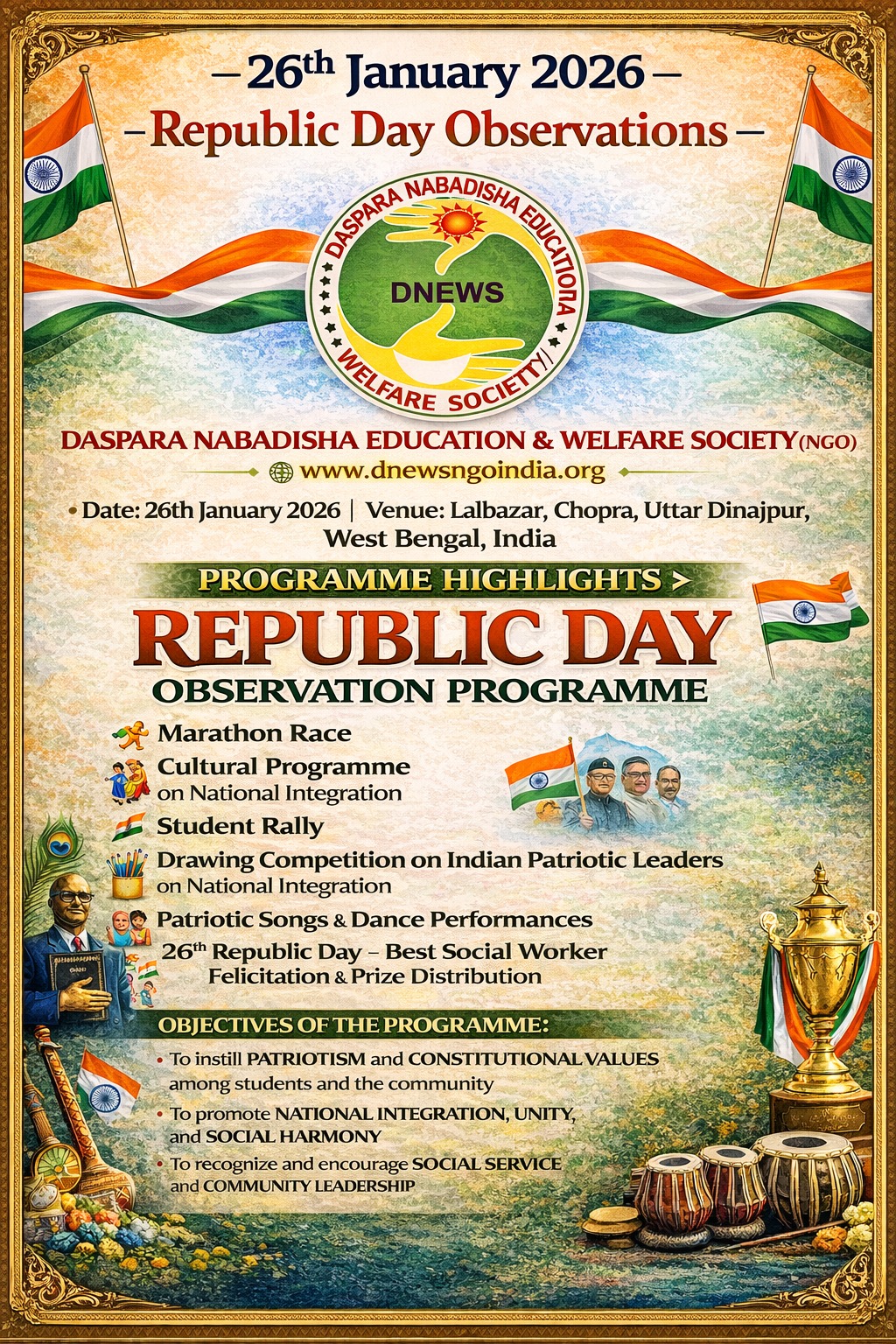 Daspara Nabadisha proudly commemorates the birth anniversary of the great freedom fighter Subhas Chandra Bose, fondly called Netaji. On this special day, we pay tribute to his indomitable courage and spirit. We conduct special events, including inspirational talks, and cultural programs, to honor his contributions to India’s freedom struggle.